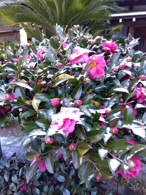 9日珍しく雪が降り山茶花の花も雪化粧です。