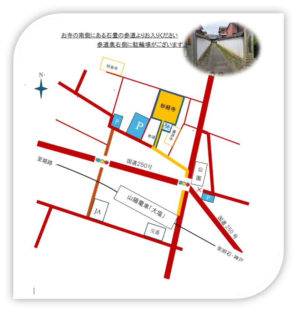 直進約40ḿ山側に「妙経寺参道」がございます。